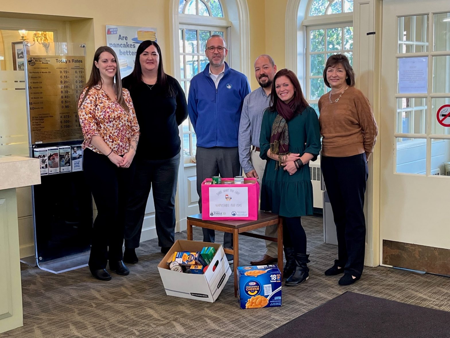 Greenfield Cooperative Bank President Tony Worden and Merrill Gagne, owner of Gagne Wealth Management in Greenfield stepped up to meet the need after Jodi Falk, Director of Rachel’s Table, a program of the Jewish Federation of Western Massachusetts, shared that there is a food shortage affecting Franklin County meal sites and pantries. Falk, after Rachel Berggren of Franklin County Community Meal Program (FCCMP) let her know that food supply chain issues were resulting in empty shelves for their pantry and no meat for their meal sites, began two campaigns – one to ask local businesses to help purchase meat for a month for FCCMP, Stone Soup Café and Salvation Army Greenfield, and the other for a county-wide food drive for nonperishables. GCB is proud to be the first business to step up and create a food drive in our Franklin County branches!